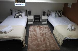 Inside, the accommodation includes seven beds across its five bedrooms along with two bathrooms fitted with walk-in showers and bathtubs for added relaxation. The living space boasts a cozy fireplace and seating area where guests can unwind after exploring the city. A fully equipped kitchen comes complete with an oven, stovetop, microwave, refrigerator, toaster, electric kettle and all necessary kitchenware alongside tea and coffee making facilities to prepare meals during your stay.